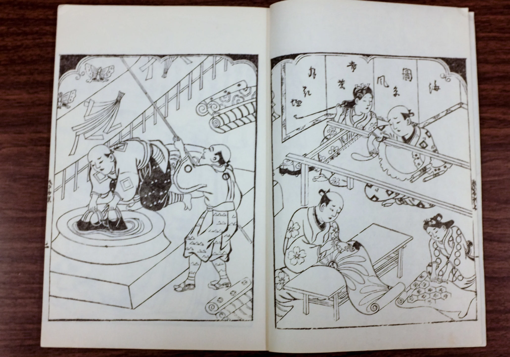 A page from one of Chiso’s Edo period kimono catalogues, showing many of the Kyo Yuzen processes including dyeing, resist paste and painting